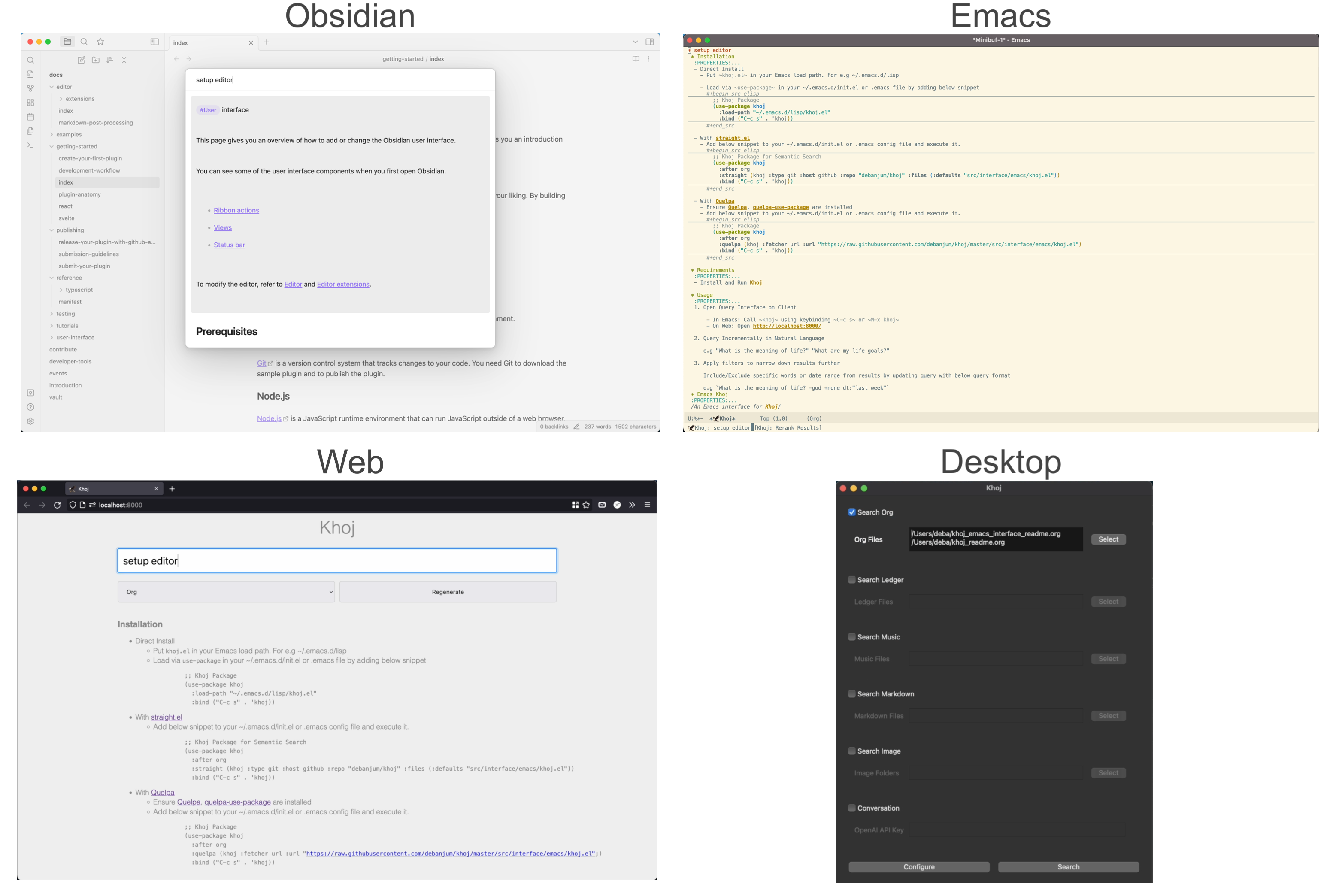 - Add Khoj in Obsidian Demo - Update Interfaces Screenshot to include Obsidian Plugin Screenshot - Update .gitignore to ignore obsidian plugin ignorelist Section the .gitignore for better readability - Update the Setup, Usage instructions to include information about the Obsidian plugin